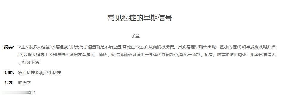 参考资料:[1]子兰.常见癌症的早期信号[J].新农村正规买球的app,2019.